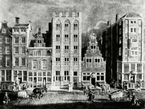 Op de afbeelding het huis Engelenburch (midden) op een tekening van D. Moens uit 1772 (Bron Gemeentearchief Rotterdam)
